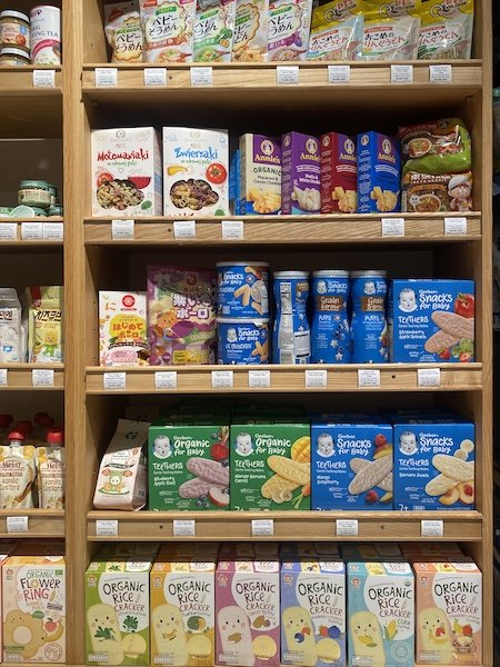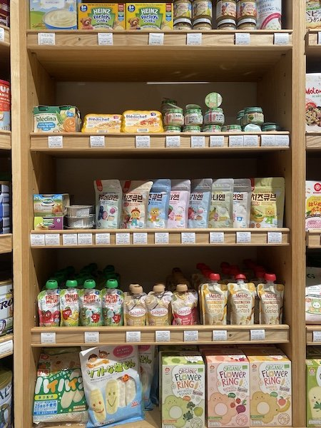 日本・韓国・東南アジア以外にも、欧米各国から輸入されたベビーフードや幼児向けスナック類が豊富に陳列されていました。